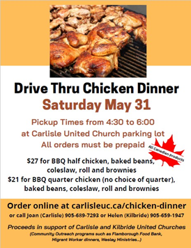 We are again having our joint Chicken Dinner fundraiser with Carlisle Church on May 31st. Enjoy a delicious drive thru dinner and skip the dishes!
