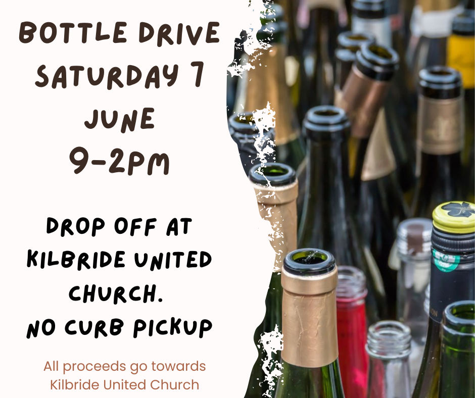 Bring your beer and wine empties to Kilbride Church for our semi annual bottle drive! See you between 9 am and 2 pm. Please, no pop cans. Related