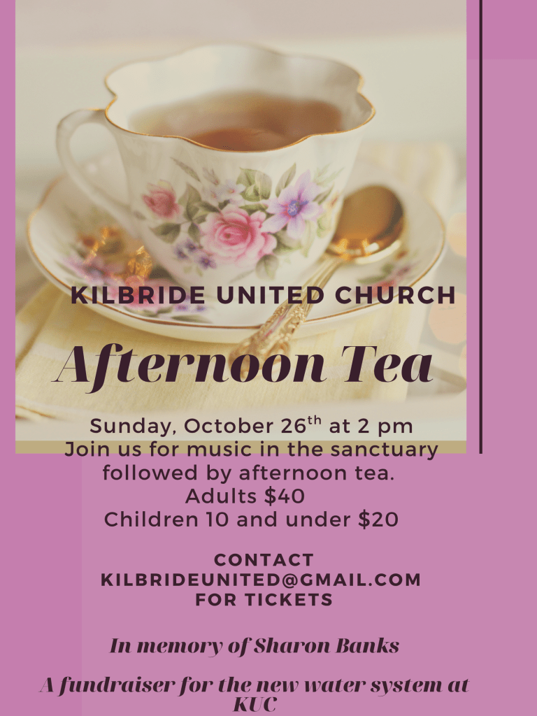 Join us for afternoon tea at Kilbride Church. Start the afternoon with music in the sanctuary before moving to the Community Room for tea. Coco Tea will be supplying the tea and giving a short talk on tea. Enjoy delicious finger sandwiches and scrumptious desserts. This tea is in memory of Sharon Banks. It is also a fundraiser for the new water system that has been installed in the Church.