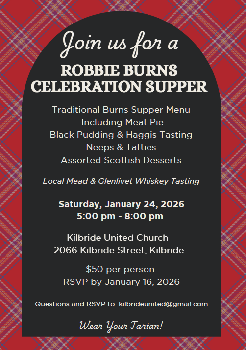 Please email the church as soon as possible to reserve your spot at kilbrideunited@gmail.com.